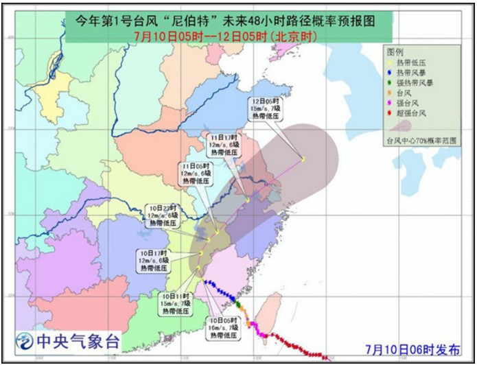 今年第1號臺風“尼伯特”已于今天(10日)凌晨3點鐘在福建省寧化縣境內減弱熱帶低壓,早晨5點鐘其中心位于福建省寧化縣境內,就是北緯26.1度、東經116.5度,中心附近最大風力有7級(16m/s),中心最低氣壓為997百帕。